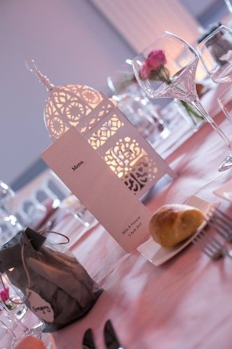 Afin d’accessoiriser davantage, vous pouvez bien entendu placer vos menus et numéros ou nom de table en centre de table.